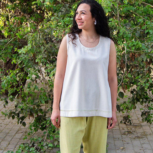 Mim's elegant, sleeveless, A-line top is crafted from a beautiful, natural beige premium quality linen fabric, offering a breathable and comfortable fit.